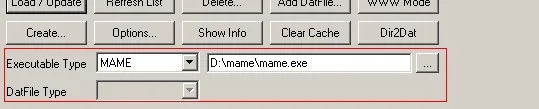 - Emulator : Choisissez le type d'émulateur dans le petit menu déroulant (sur l'exemple c'est mame.exe). Pour ceux qui n'y figurent pas, il faudra opter pour des fichiers .dat (voir Add datfile).
