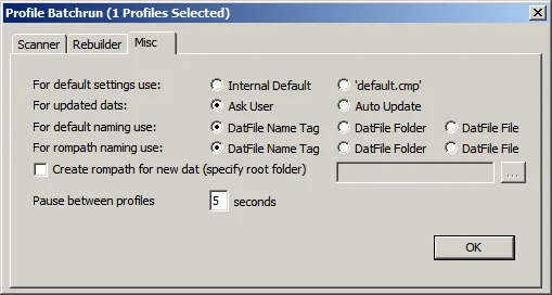 Ce dossier devient le dossier rompaths de chaque profils (avec le sous-dossier configuré ci-dessus). - Pause between profiles : clrmamepro fera une pause entre chaque profil de "tant" de secondes.